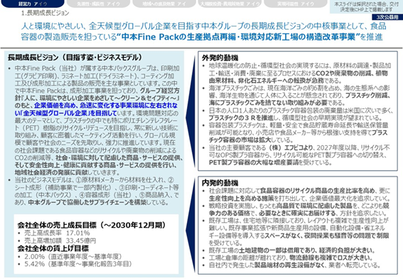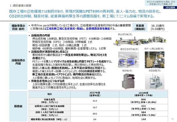 ・採択企業(3次公募)の一例として、3次公募で当社がサポートし採択された「中本Fine Pack株式会社」の事例を紹介します。本事例の特徴は、食品容器分野を中核事業と位置付け、人と環境にやさしいグローバル企業を目指す長期成長ビジョンのもと、生産拠点の再編と環境対応型新工場の構造改革を同時に進めている点にあります。既存工場の立地制約により課題となっていたPET材料の再利用、省人・省力化、物流効率化、CO₂排出削減、騒音対策などを、新工場への生産集約と一貫生産体制の構築によって解決しています。