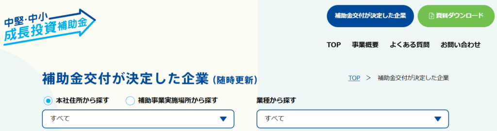 ・なお、過去の大規模成長投資補助金で採択された企業の事例は、中堅・中小成長投資補助金事務局のHPにて公開されています。「補助金交付が決定した企業(随時更新)」の住所、又は業種から採択企業の事例を検索できます(以下参照)。