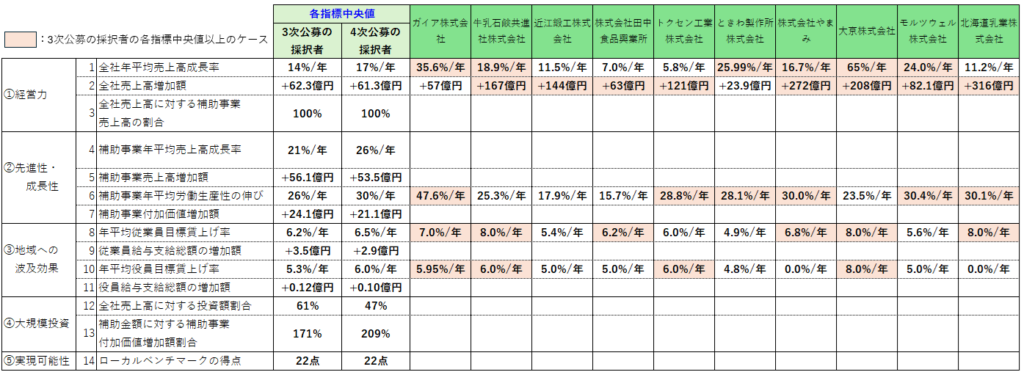 これまでに4回の公募が実施され、公募回ごとに採択者および申請者全体の各指標中央値が公表されてきました。その結果、すべての公募回において、採択者の指標中央値は申請者全体を上回っており、各指標が高いほど採択されやすい傾向が明確に表れています。