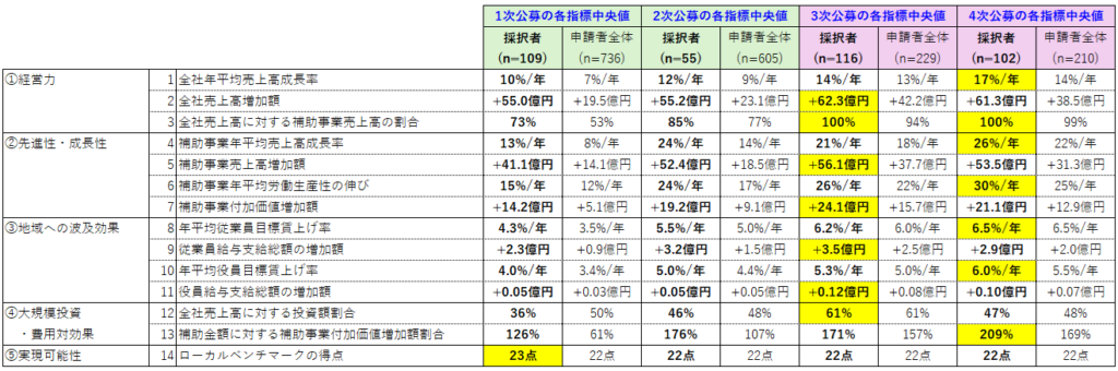 これまでに4回の公募が実施され、公募回ごとに採択者および申請者全体の各指標中央値が公表されてきました。その結果、すべての公募回において、採択者の指標中央値は申請者全体を上回っており、各指標が高いほど採択されやすい傾向が明確に表れています。