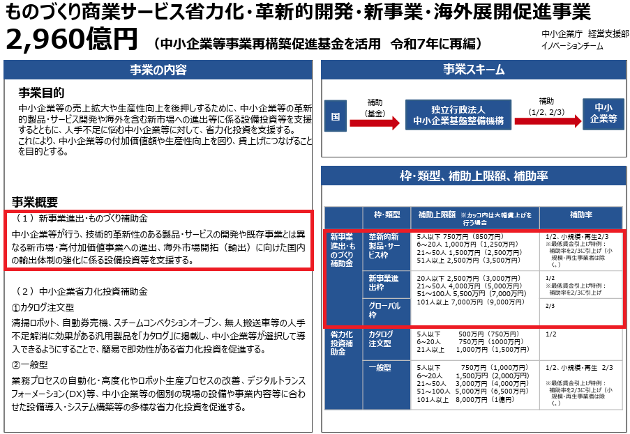 令和7年度補正予算では、同補助金が「革新的製品・サービス開発や新市場進出を通じた成長支援」の柱として整理されており、令和8年度においても継続的な公募が見込まれます。