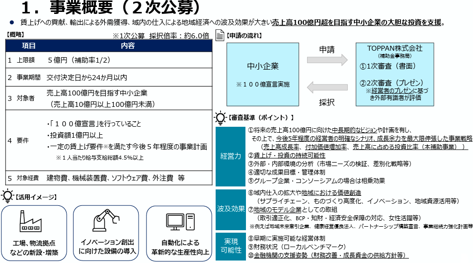 審査は、一次審査(書類審査)および二次審査(外部有識者によるプレゼンテーション)の二段階で実施され、①経営力、②先進性・成長性、③地域への波及効果、④大規模投資・費用対効果、⑤実現可能性の5つの観点から総合的に評価されます。特に、地域経済への波及効果や賃上げへの具体的なコミットメント、金融機関を含めた資金調達計画の妥当性が重要な評価ポイントとなる見込みです。
