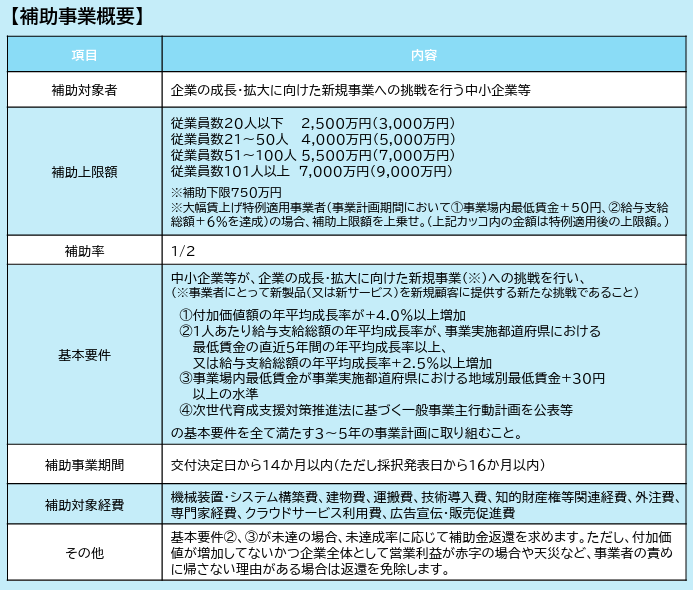 基本要件としては、新たな製品・サービスを新たな顧客層に提供する取り組みであることに加え、付加価値額の増加や一定水準の賃上げ計画を伴うことなどが求められます。単なる設備更新や既存事業の延長ではなく、「新規性」と「成長性」が明確に問われる点が本補助金の特徴です。
