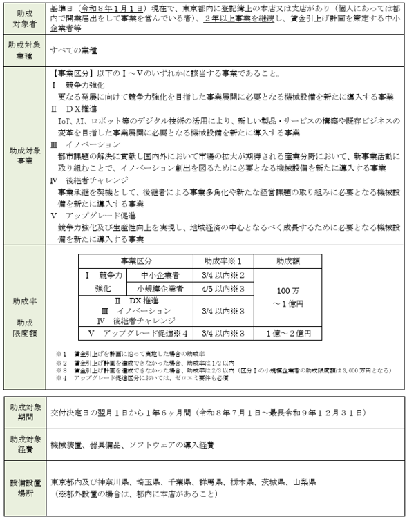 国の補助金に加えて、東京都独自でも中小企業の設備投資を支援する助成金制度が用意されています。ここでは、令和7年度補正予算等を踏まえ2026年度に東京都が実施予定の主な設備投資関連助成事業を2つ紹介します。いずれも東京都内中小企業者が対象で、国の補助金とは別枠で併用も可能な場合があります。