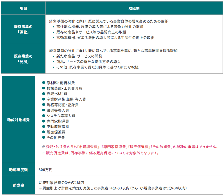 具体的には、「既存事業の深化」として、高性能機械の導入による競争力強化や製品・サービス品質向上、「既存事業の発展」として、既存事業を基盤とした新商品の開発・提供開始や、新たな販売手法の導入などが対象例となります。