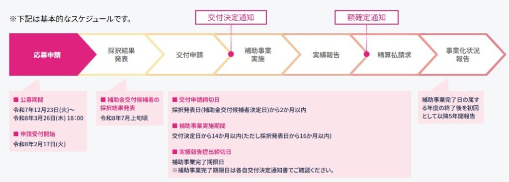 補助金交付候補として採択された場合には、2025年8月から9月ごろに交付申請を行って、2026年春までに事業を実施するスケジュールです。