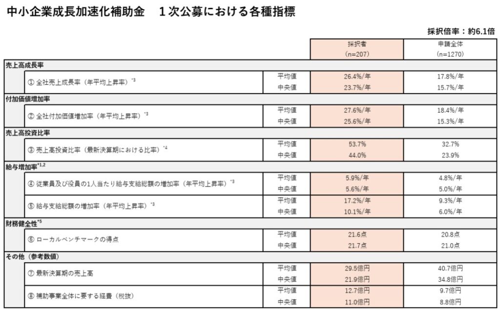 中小企業成長加速化補助金では、事業内容の新規性や市場性に加え、売上高成長率や付加価値増加率、投資規模などの各種指標をどの程度達成できる計画かが、採択に向けた重要な評価ポイントとなります。実際に、1次公募の採択者と申請全体の指標を比較すると、採択者は売上高成長率や付加価値増加率、売上高投資比率などの数値が全体平均を上回っている傾向が見られます。このことから、これらの指標について採択者水準を意識した数値計画を立てることが、特に1次審査(書類審査)の通過の可能性を高める要素であるといえます。