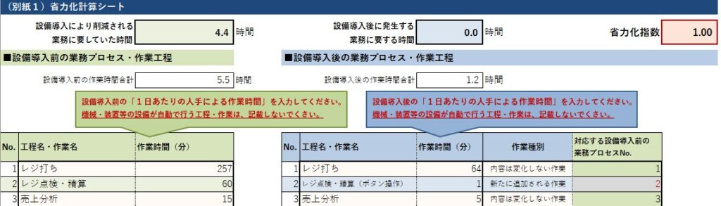 中小企業省力化投資補助金(一般型)では、導入する設備によって、どの程度の省力化効果が見込めるかが、採択に向けた重要な評価ポイントとなります。特に、作業時間の短縮、生産量あたりの投入工数の低減などをもとに算出される省力化指数が高い計画ほど、評価されやすい傾向にあります。そのため、導入前後で作業人数・作業時間がどのように変化するのかを定量的に示すことがポイントとなります。